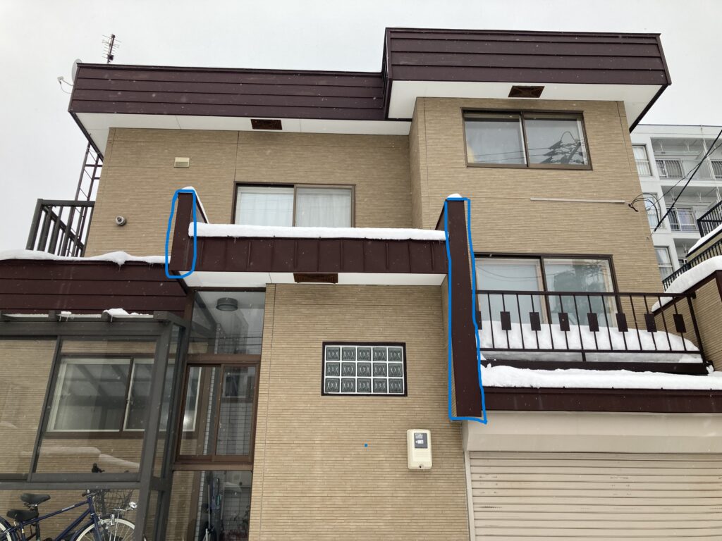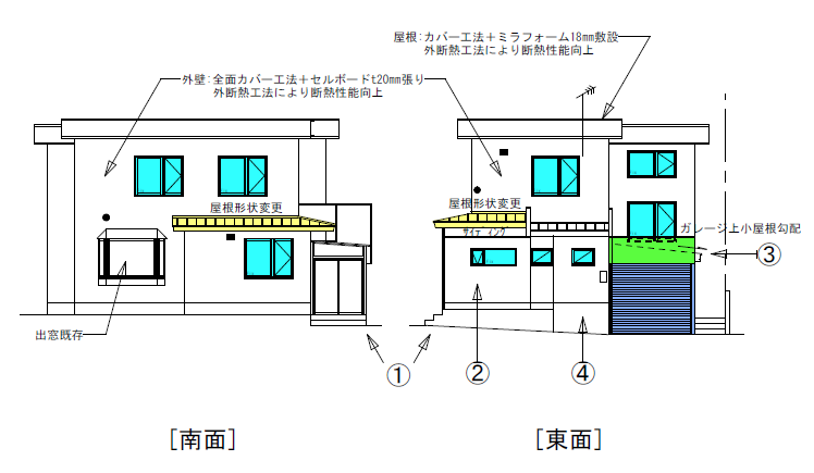 - 風除室上の突出した小屋根、2階ベランダを撤去し、L型の小屋根とした