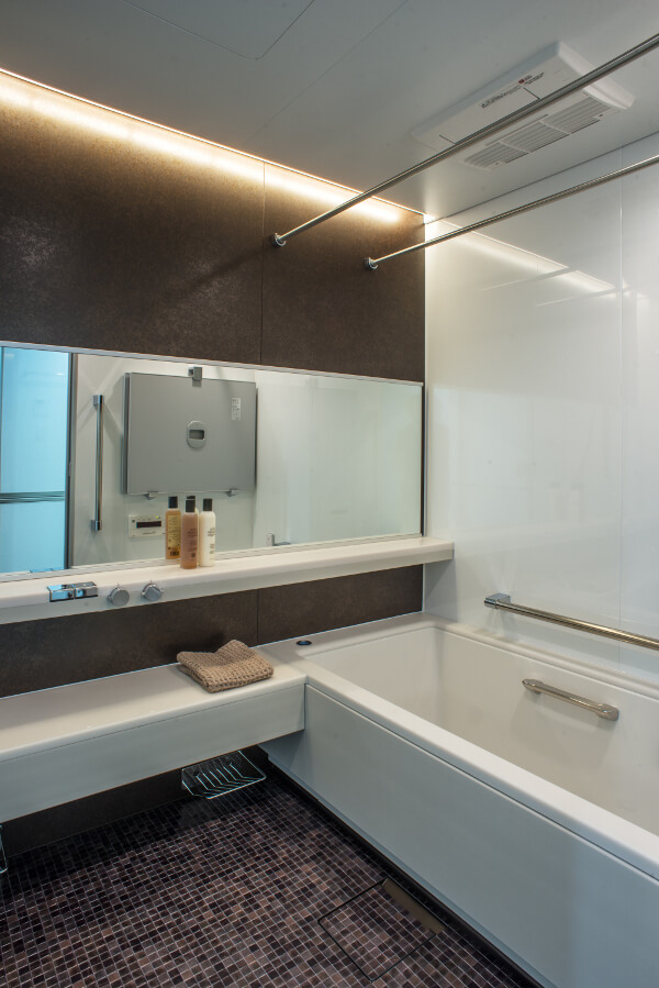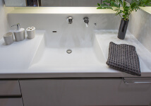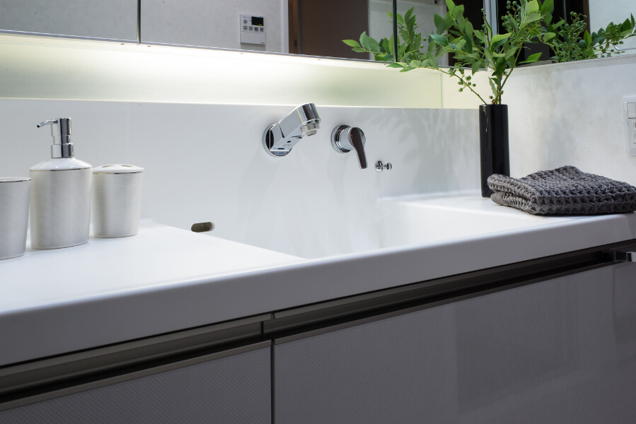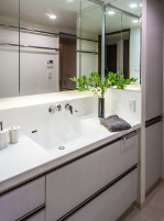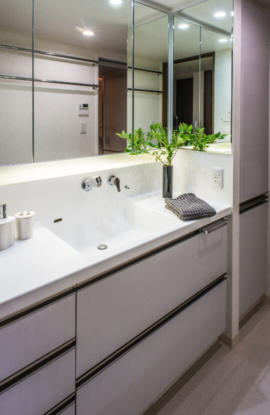 | 洗面化粧台の高さ 約800mm(ヘルスメーター収納付) 三面鏡収納タイプ、リネン棚(ランドリーバスケット付) 三面鏡収納下には間接照明によるやわらかな光、 スクエア型ボウル一体カウンターでシンプルな機能美、 水と光による、洗練された空間を演出。 |
