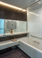 | 浴槽のまたぎの高さ 約430mm バスルームの出入り口 またぎの高さ 約25mm 間接照明によるやわらかな光の陰影と細部までこだわりぬいた壁、床、水栓、 包み込まれるような入り心地で、心も身体もリラックス。 豊かで上質な眠りへといざないます。 |