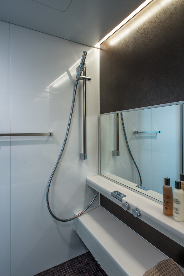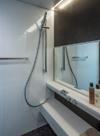 | シンラは、今までのバスルームのイメージをいかに払拭できるかからモノづくりを始めた、TOTOの最高級シリーズです。 従来のユニットバスの浴槽は、FRP(強化プラスチック)、洗い場カウンターと浴槽にある段差や工業製品のイメージが大変、強いものでした。シンラの浴槽の材質は、マーブライト(TOTO製人工大理石)仕様。 浴槽から洗い場カウンターを一体化することで高級感を醸し出しています。もはやバスルームは、リビングと同様なくつろぎとインテリア性を追及されています。まさに“バスリビング”と進化しています! |