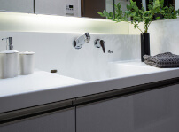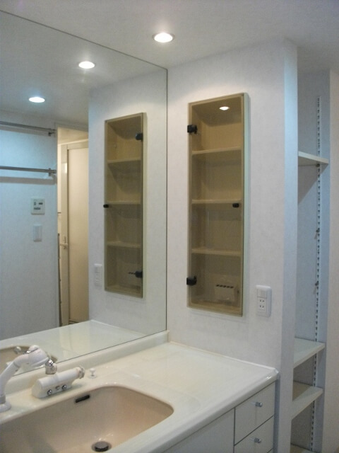 | 従来の洗面化粧台もマーブライトのカウンターで上品な洗面化粧台でしたが使い勝手の良さや充実した収納を確保するため、交換することになり、奥様のご要望により、初めて、ハイバック式カウンタータイプの洗面化粧台の造作を試みました。 | |
