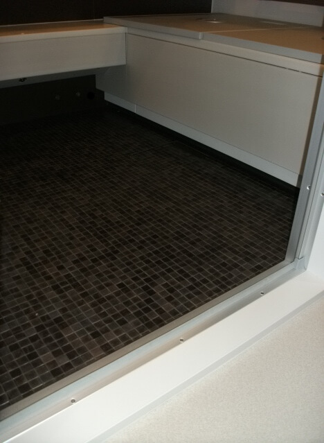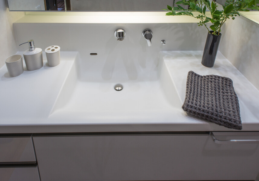 | 洗面化粧台の高さ・・・約750mm 一面鏡、サイド収納、リネン棚(オープン) |