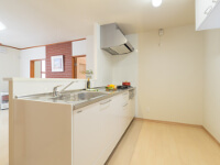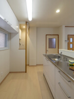 | ■調理中も家族の様子を見たりコミュニケーションがとれる対面キッチン。右奥は洗濯機スペースへ変更 | ■キッチン上の吊戸棚をあえて後ろ側に取り付け。開放的なキッチンに… |