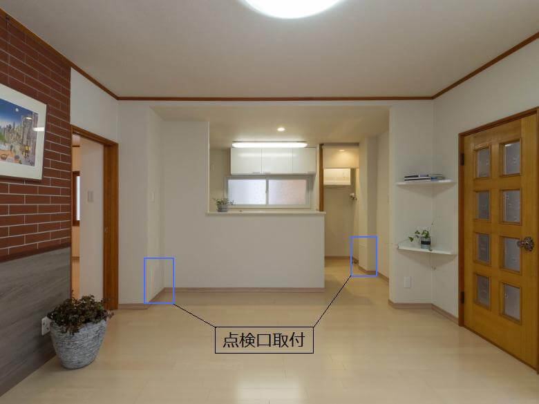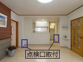 | 一階台所スペースには、パイプシャフト(PS)を設け、点検口を取り付けました。(写真参照 ↑) また、排水においては、排水時に音がするため、遮音シートを巻くことで、軽減されました。一般住宅にはない特性であり、目に見えないところも大切なので、オーナーも快く承諾をいただきました。 |
