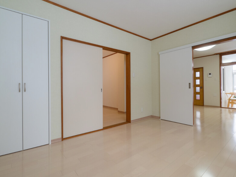 ■リビングと洋室は間仕切壁を設置。既存の3方枠を切り詰め再利用し、ハンガー戸を新設。 |