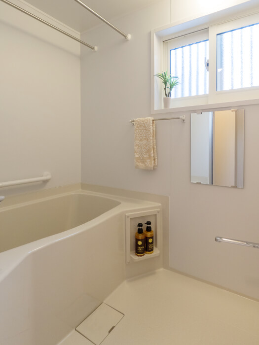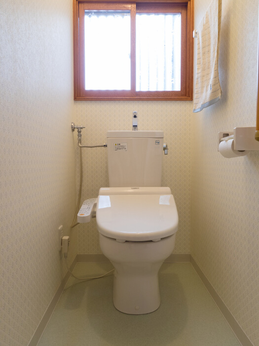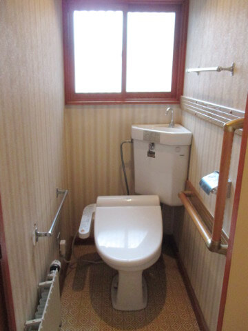 | ■お掃除しやすいスッキリとしたデザイン。内窓も樹脂サッシになりお手入れラク。ランドリーパイプ2本も便利。 | ■便器の両サイドにはゆとりができ、全体的に明るくさわやかなイメージに。 ■扉上は収納棚 壁面に手摺り設置 |