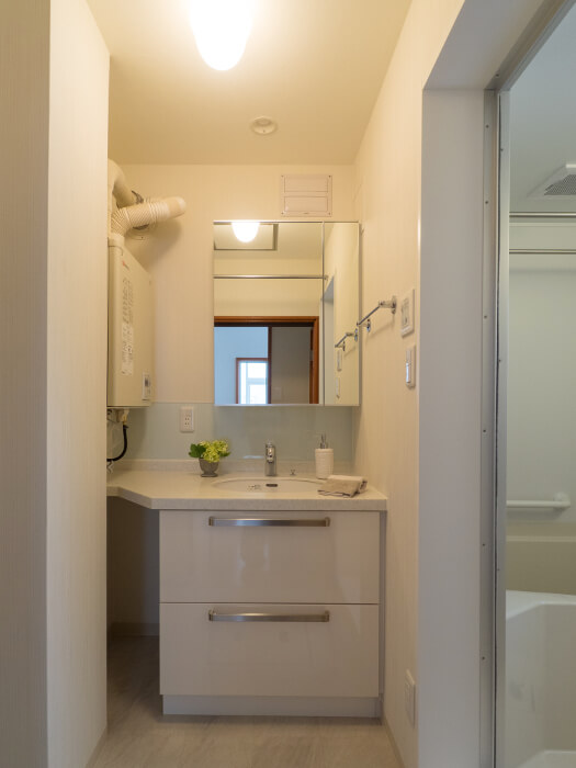 ■正面にあった窓を塞ぎ造り付けの洗面化粧台と2面鏡(収納付)を取付。ボイラーは壁掛けでスッキリ納まりました。 |